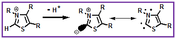Figure 1.4: The thiazolium ion loses a proton at C-2 to form a zwitterion that has a carbene resonance form. This resonance hybrid species is the catalytic form in biochemical reactions catalyzed by thiamine diphosphate.