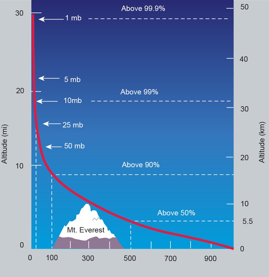 Atmospheric pressure decreases rapidly with height. Climbing to an altitude of only 5.5 km where the pressure is 500 mb, would put you above one-half of the atmosphere's molecules. |