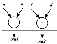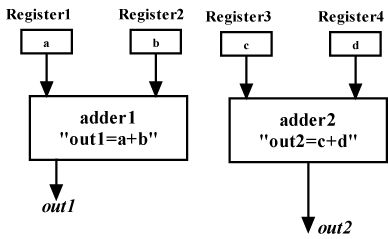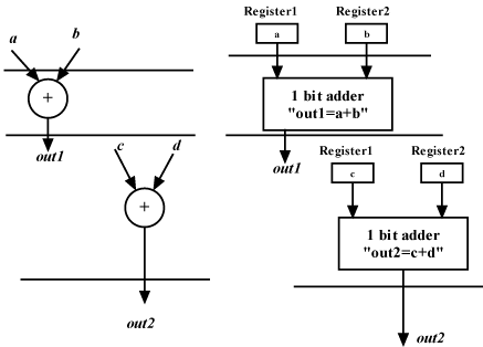 Now depending on availability of hardware resources and time constraints the scheduled operators and variables are allocated and binded to hardware units. Let there be one adder and two registers in the library. So the two operations (addition) of the example, even if scheduled in one control step, cannot be allocated to the single adder. Similarly, the four variables cannot be allocated to two registers. In the running example with the given resource constraints, the two operations can be done in two control steps: Step 1- variable a is allocated to Register1, variable b is allocated to Register2 and operation “out1=Register1+Register2;” is allocated to adder; Step 2- variable c is allocated to Register1, variable d is allocated to Register2 and operation “out2=Register1+Register2;” is allocated to adder. Figure 3 illustrates allocation and binding (of variables and operations) for the running example when there is one adder and two registers in the library.