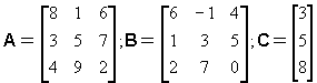 Exercise M1.4Consider three matrices A, B, and C given below. Perform the following operations: A+B, B-C, A*C, A.*B, A./C, A.\B, A./B, (B*C)^3, and C.^3. Countercheck MATLAB answers manually. Try to interpret errors, if any.