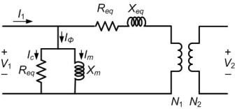 The equivalent circuit of a single-phase transformer is shown in Fig. 1.18. In this the primary voltage and currents are denoted by V1 and V2 respectively. The current entering the primary terminals is I1. The core loss component is represented by Rcwhile the magnetizing reactance is denoted by Xm . The leakage inductance of the transformer is denoted by Xeqand Req is transformer winding resistance. It is to be noted that all the quantities are referred to the primary side. The turns ratio of the transformer is given by N1 : N2 .
