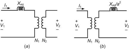 The impedance of the shunt branch is much larger compared to that of the series branch. Therefore we neglect Rcand Xm. Again of the series parameters, Reqis much smaller than Xeq. We can therefore neglect the series impedance. Therefore the transformer can be represented by the leakage reactance Xeq. The single-phase transformer equivalent circuit, when referred to the primary side, is as shown is Fig. 1.19 (a). The equivalent circuit, when referred to the secondary side, is shown in Fig. 1.19 (b) where a = N1 / N2 .