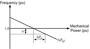 The steady state power-frequency relation is shown in Fig. 5.3. In this figure the slope of the ΔPref line is negative and is given by