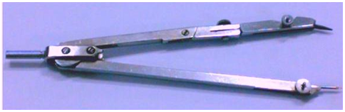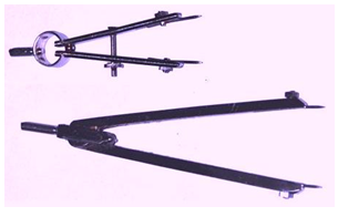 These are used to draw arcs or circles. Generally two sizes of compasses: one large compass and the other a small spring bow compassĀ are commonly found. Each compass consist of a needle point and a pencil point. For drawing very large radius arcs, the pencil point leg can be removed from the knee joint and a lengthening bar can be inserted to increase the radius of the arc. Figure 4 shows the photograph of a compass.Figure 4 shows the photograph of a compass.