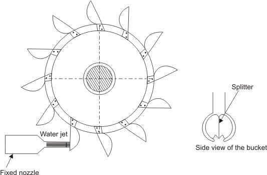 The number of jets is not more than two for horizontal shaft turbines and is limited to six for vertical shaft turbines. The flow partly fills the buckets and the fluid remains in contact with the atmosphere. Therefore, once the jet is produced by the nozzle, the static pressure of the fluid remains atmospheric throughout the machine. Because of the symmetry of the buckets, the side thrusts produced by the fluid in each half should balance each other.