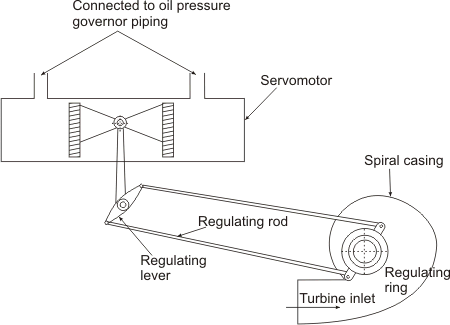 Governing of Reaction Turbines Governing of reaction turbines is usually done by altering the position of the guide vanes and thus controlling the flow rate by changing the gate openings to the runner. The guide blades of a reaction turbine (Figure 32.2) are pivoted and connected by levers and links to the regulating ring. Two long regulating rods, being attached to the regulating ring at their one ends, are connected to a regulating lever at their other ends. The regulating lever is keyed to a regulating shaft which is turned by a servomotor piston of the oil