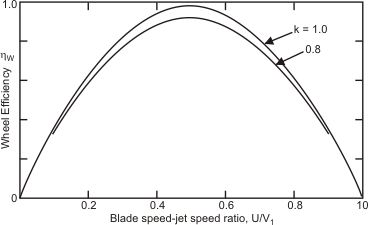 Figure 27.1 Theoretical variation of wheel efficiency for a Pelton turbine with blade speed to jet speed ratio for different values of k
