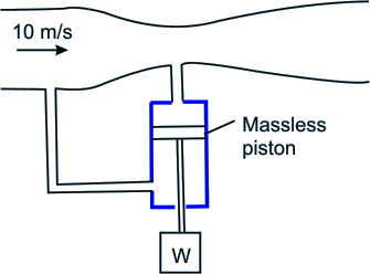 6. Fig. 16.6 shows the weight W supported by the pressure difference created in the venturi and applied across the piston. At the inlet the air velocity is 10 m/s and the area is 100 cm2. The throat area is 4 cm2. Given that the air density is equal to 1.2 kg/m3, calculate the weight W that will be in equilibrium. Assume ideal flow in the duct, no friction between the piston and cylinder, and the piston has no mass.