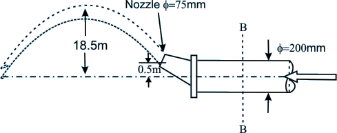 8. A free jet of water is produced using a 75 mm diameter nozzle attached to a 200 mm diameter pipe, as shown in Figure 16.8. If the average velocity of water at plane B is 3.8 m/s, calculate the velocity of water at point A in the free jet. Neglect friction losses in the nozzle and pipe.