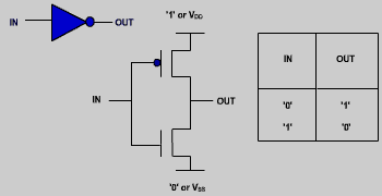The inverter is universally accepted as the most basic logic gate doing a Boolean operation on a single input variable. Figure 1.3 depicts the symbol, truth table and a general structure of a CMOS inverter. As shown, the simple structure consists of a combination of an pMOS transistor at the top and a nMOS transistor at the bottom.