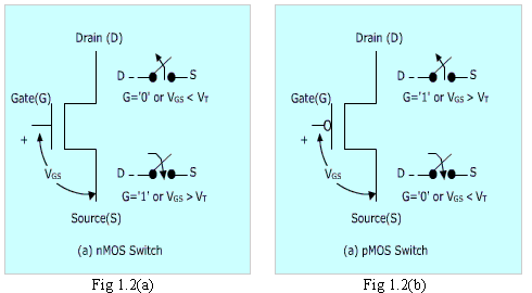 The voltage applied at the gate terminal regulates the flow of current between the source and the drain. In this way, a MOS transistor may be viewed as a simple on/off switch.