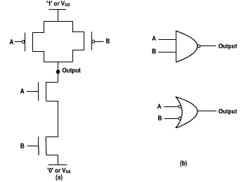 1.2.3 NAND and NOR Gates Figure 1.5 depicts CMOS implementation of a two-input NAND gate and its typical symbol. The pull-down sub-circuit is made of a series combination of two nMOS transistors. These are responsible for conducting logic '0' to the output node when both of the gates are at logic '1'. |